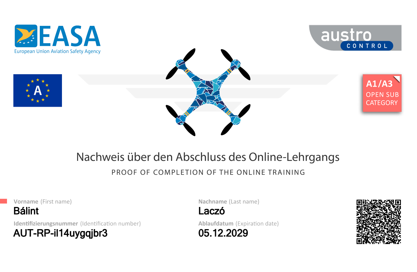 2024 decemberében a IoT tantárgy keretein belül sikeresen teljesítettem a drón vizsgát, amely során elméleti és gyakorlati tudásomat is bizonyítottam. Az Európai Unió által elismert drón jogosítványt megszereztem, amely lehetővé teszi számomra, hogy szabályozott környezetben drónokat üzemeltessek.