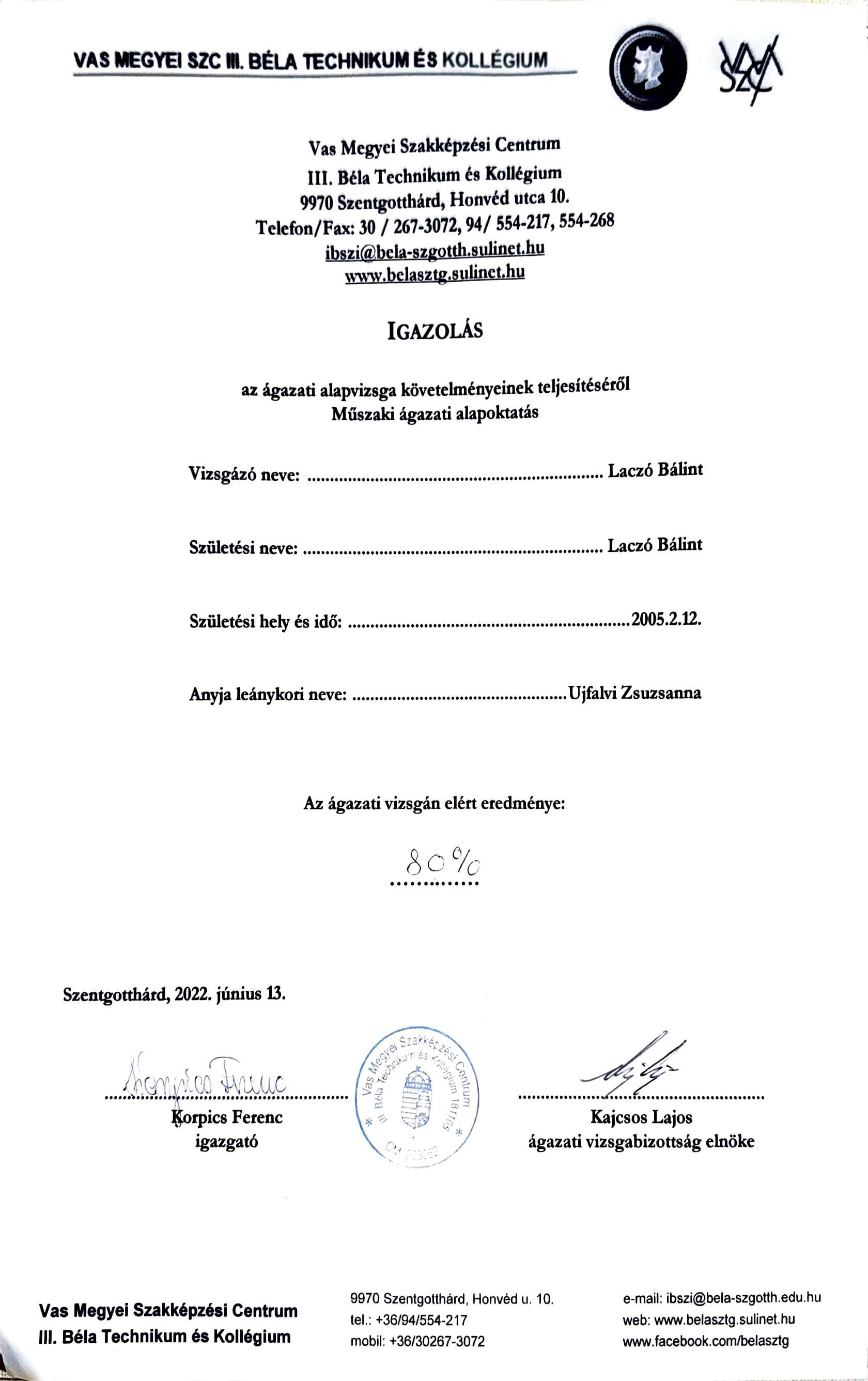 A gyakorlati vizsga során a pontosságműködőképesség és a dokumentálás voltak a legfontosabb szempontok. A vizsga során kiemelt figyelmet fordítottam a munkavédelmi szabályok betartására és a környezettudatos munkavégzésre.